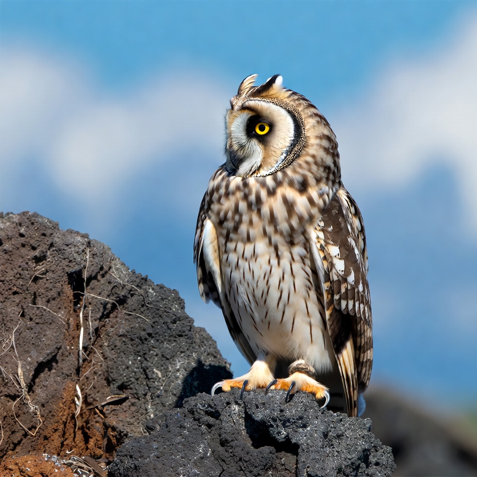 animal, bird, birdwatching, black rock, blue sky, clouds, ear tufts, feathers, feathers pattern, isolated background, lava rock, nature, perched, raptor, short-eared owl, talons, wildlife, yellow eyes, owl