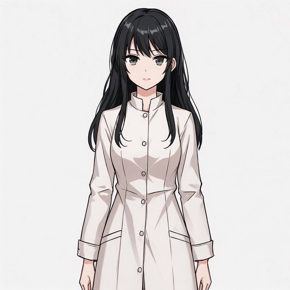 An anime girl with long black hair stands wearing a white collared coat with buttons. She has large green eyes and a neutral expression on a plain background. The illustration features clean lines and vibrant shading typical of anime style.