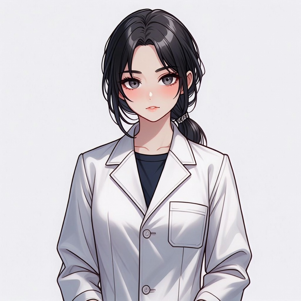An anime-style illustration features a young woman with long black hair tied in a ponytail, wearing a white lab coat over a black turtleneck. She stands against a plain white background with a gentle blush on her cheeks and expressive purple eyes. Her hair is slightly messy, and she has a subtle smile.