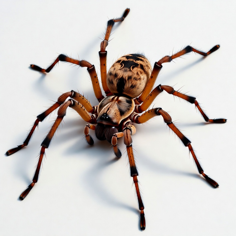 animal, arachnid, brown spider, eight legs, fangs, hairy legs, insect-like, isolated, long legs, macro photography, spider, spotted pattern, white background, wildlife, huntsman spider