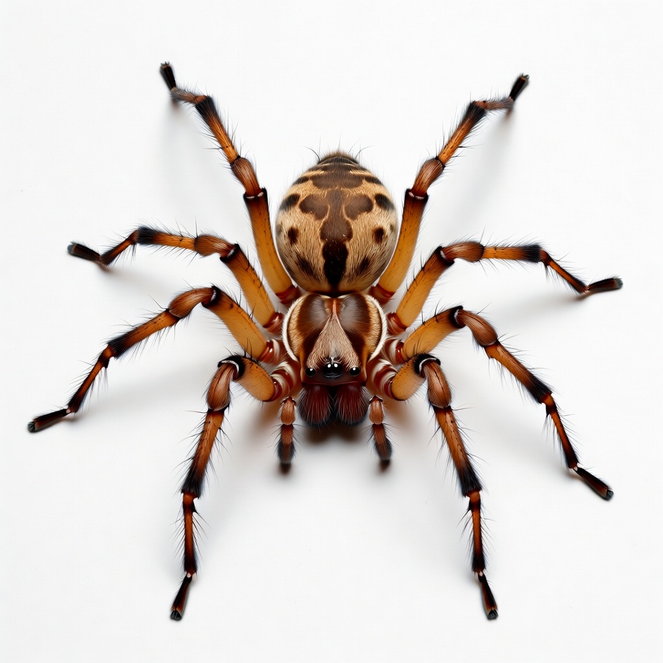animal, arachnid, brown spider, closeup, hairy legs, insect, isolated, legs spread, long legs, macro photo, pattern, spider, spots, spotted spider, white background, wildlife, huntsman spider