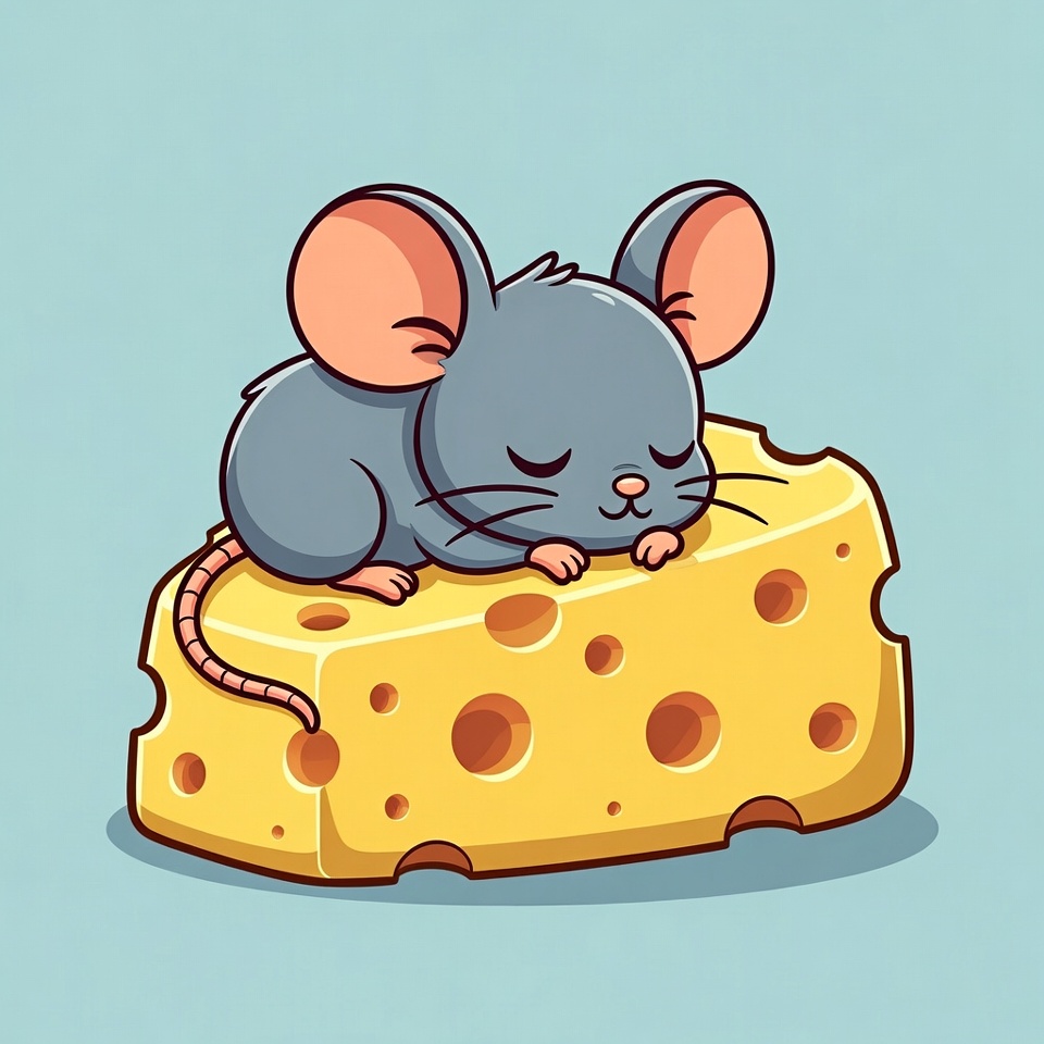 A cute cartoon gray mouse with large ears sleeps peacefully on a large yellow wedge of cheese. The mouse has closed eyes, a small smile, and pink paws resting on the cheese. The illustration features a light blue isolated background.