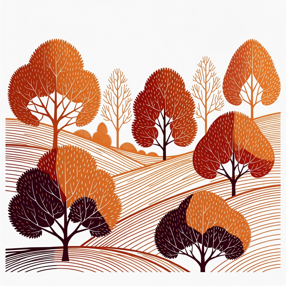 branches, brown trees, clipart, earthy tones, fall foliage, foliage, graphic design, hills, illustration, landscape, leaves, nature, orange trees, red trees, rolling hills, seasonal, stylized trees, vector art, white background, autumn trees