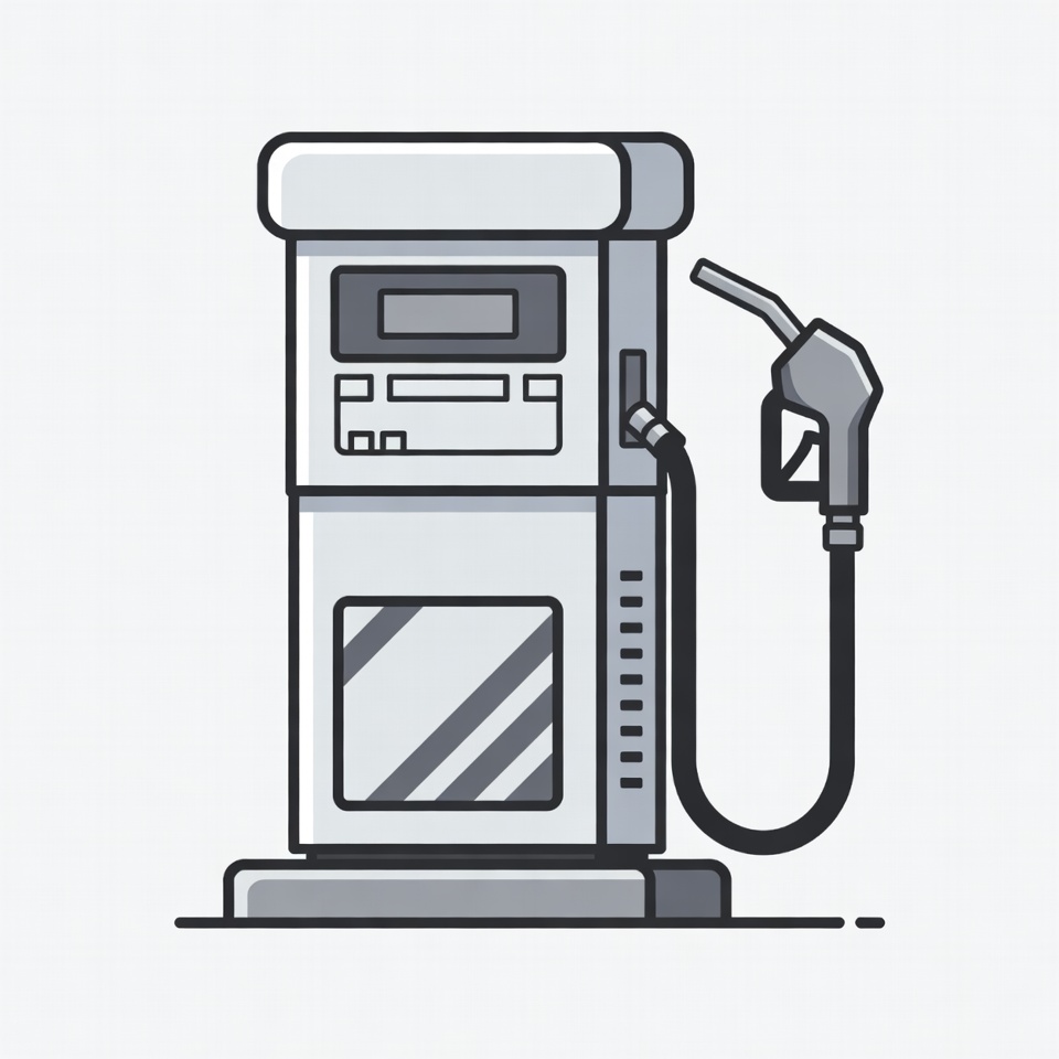A simple line art illustration of a white gas pump on a gray background. The pump features a digital display screen, a black hose, and a nozzle hanging from it. It has a modern, minimalist design with subtle shading.