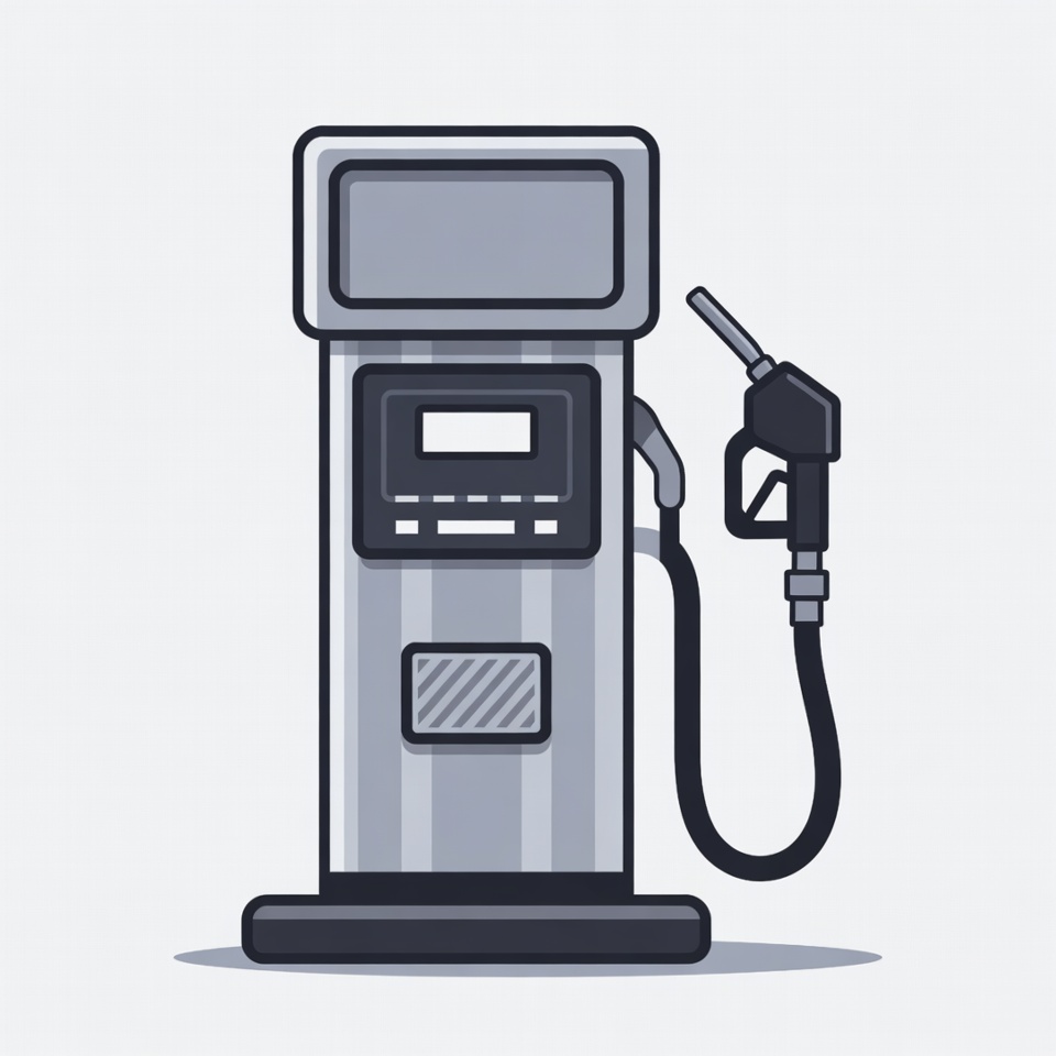 A simple line art illustration of a gas pump on a white background. The pump features a gray screen, digital display, and black hose with nozzle. It stands isolated with minimal shading and clean outlines.