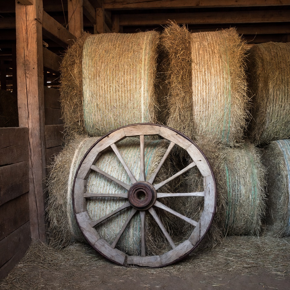 agriculture, barn, barn interior, countryside, dirt floor, farm, farm equipment, farming, golden hay, harvest, hay storage, hayloft, haystack, livestock feed, round bales, rural, rustic, stacked bales, straw, vintage wheel, wagon wheel, wooden beams, wooden walls, wooden wheel, hay bales