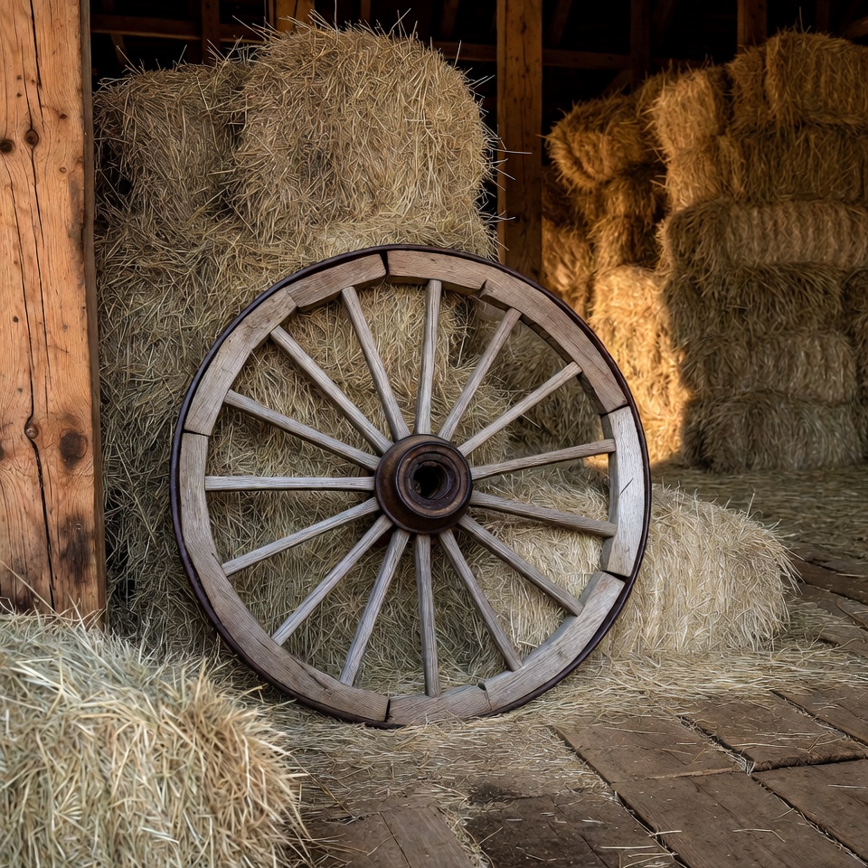 A large wooden wagon wheel with spokes leans against tall stacks of golden hay bales inside a rustic barn. Sunlight filters through the wooden beams, casting warm shadows on the hay and wheel. The barn floor is made of wooden planks scattered with stray hay.