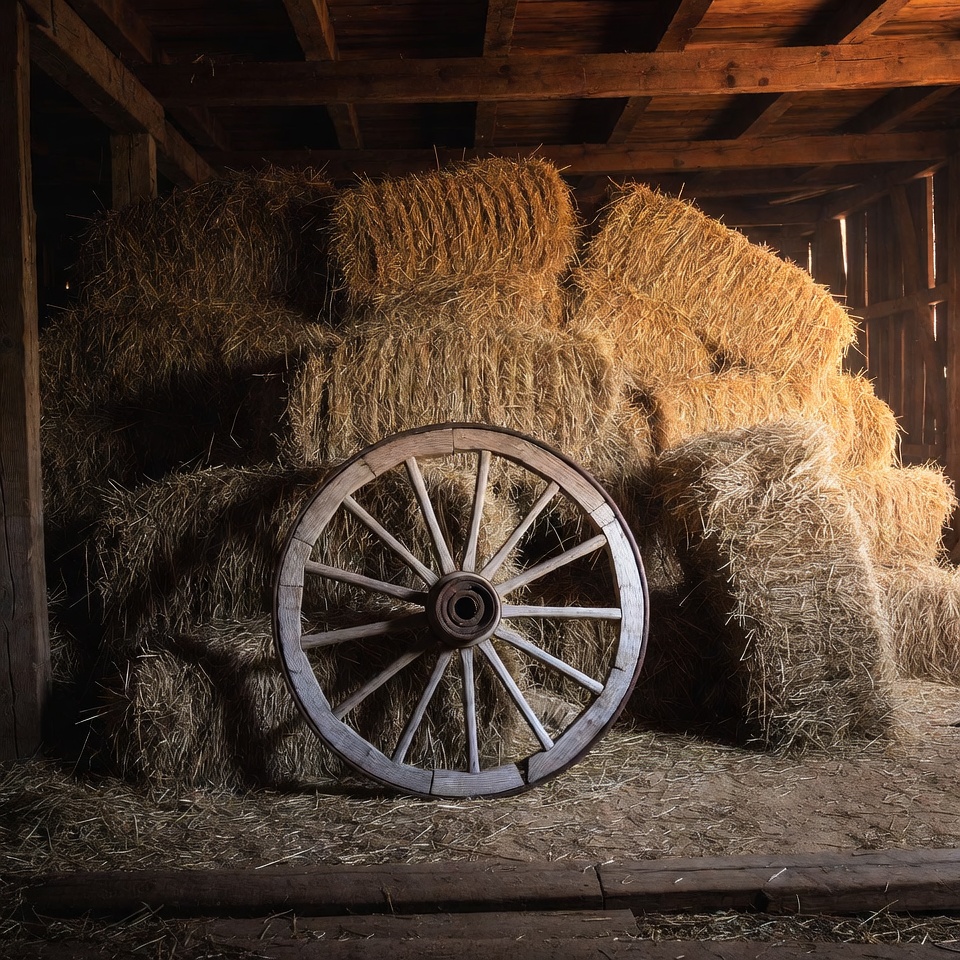 A large wooden wagon wheel leans against a towering stack of golden hay bales inside a rustic wooden barn. The hay bales are tightly bound and piled high, filling much of the barn's interior. Dim lighting highlights the textures of the wood and straw.