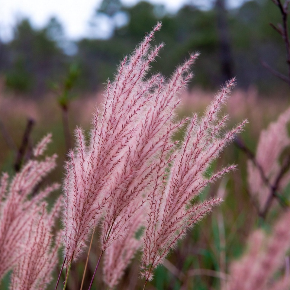 Clusters of tall pink fountain grass sway gently in a lush green field. The feathery plumes are detailed with fine pink hairs against a blurred background of trees and grass. Sunlight filters through the grasses, highlighting their soft texture.