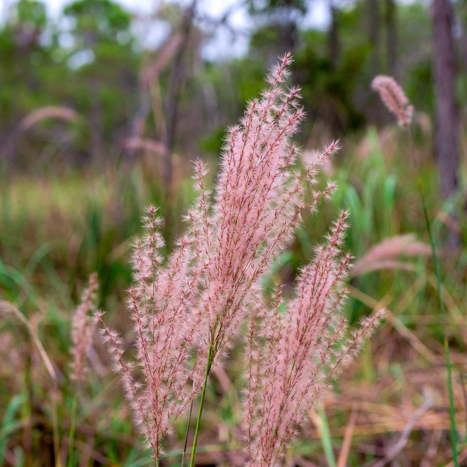 blurry background, feathery grass, field, flora, forest, grass, grassy field, green trees, landscape, natural light, nature, outdoor, pink grass, pink plumes, pinkish hue, plants, tall grass, wild grass, woods, fountain grass