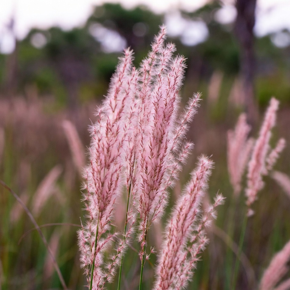 Close-up of pink fountain grass plumes swaying in a grassy field. The soft pink feathery stalks stand tall against a blurred natural background with trees. Sunlight highlights the delicate hairs on the grass.