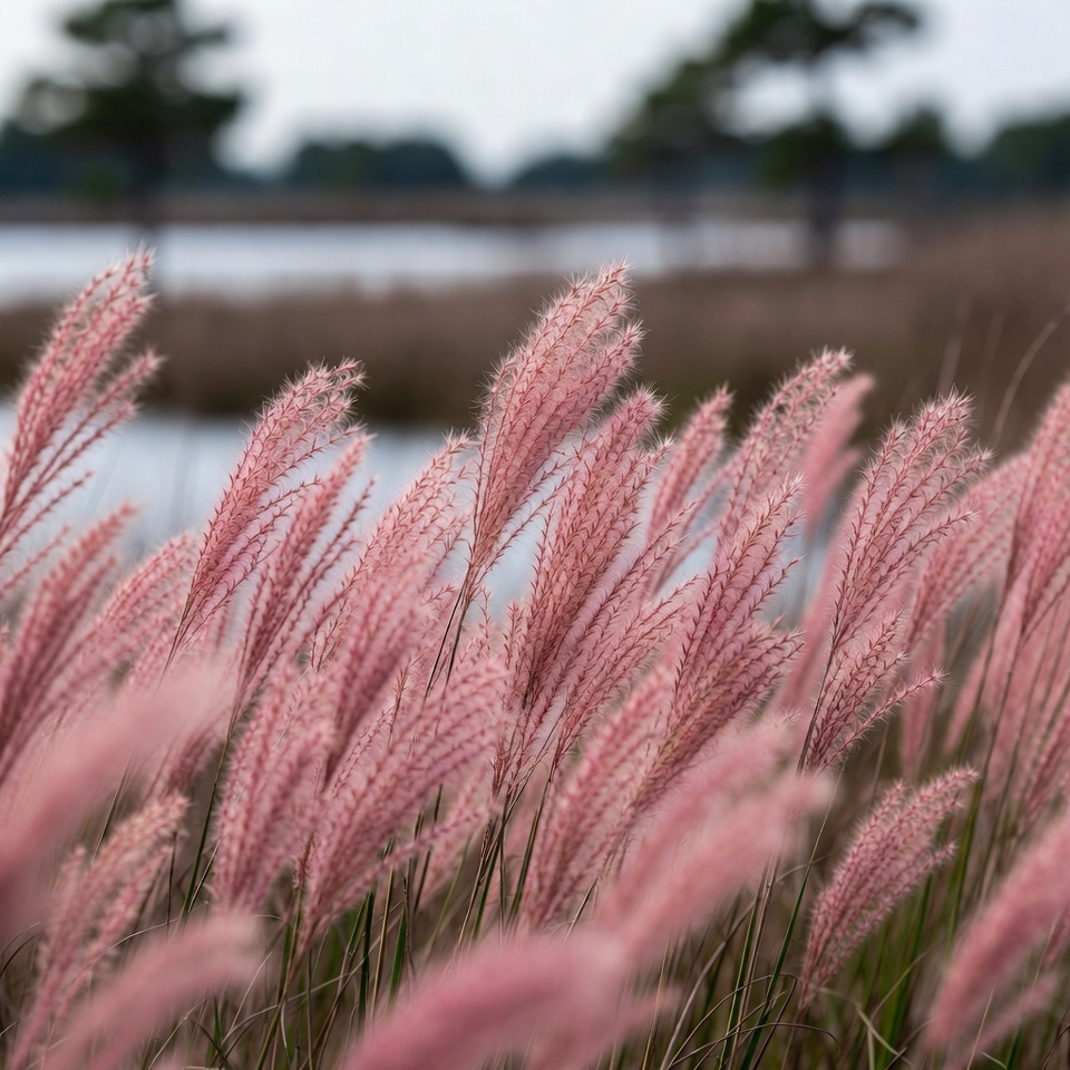 autumn grass, blur background, feathery grass, fountain grass, grass field, lake, landscape, marsh, nature, outdoor, overcast sky, pampas grass, pine trees, pink foliage, pink plumes, reeds, serene landscape, water, wetland, pink grass