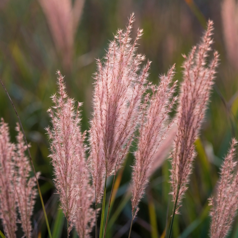 Tall pink fountain grass plumes sway gently in a lush green field. The feathery seed heads glow in soft lighting against a blurred background. Multiple stalks cluster together, showcasing their fluffy pink texture.