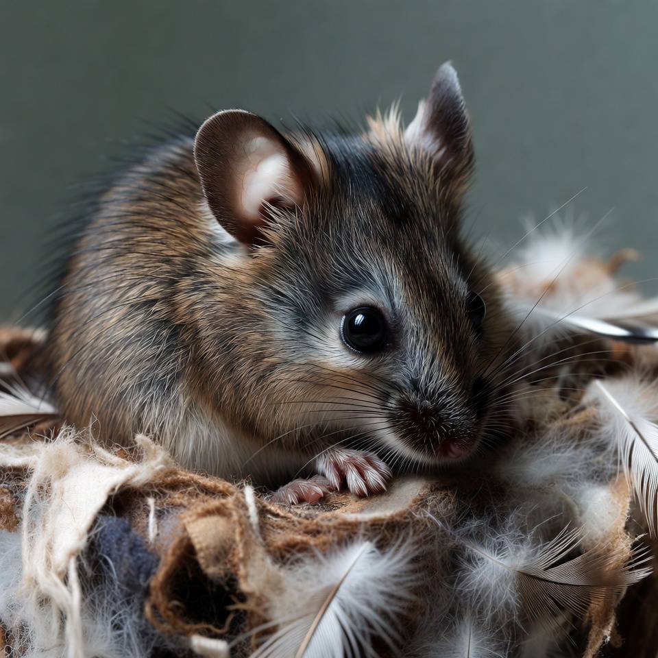 A small brown mouse with large dark eyes sits nestled in a nest made of white feathers and brown fibers. Its whiskers are prominent, and its tiny pink paws are visible. The mouse gazes forward against a neutral background.