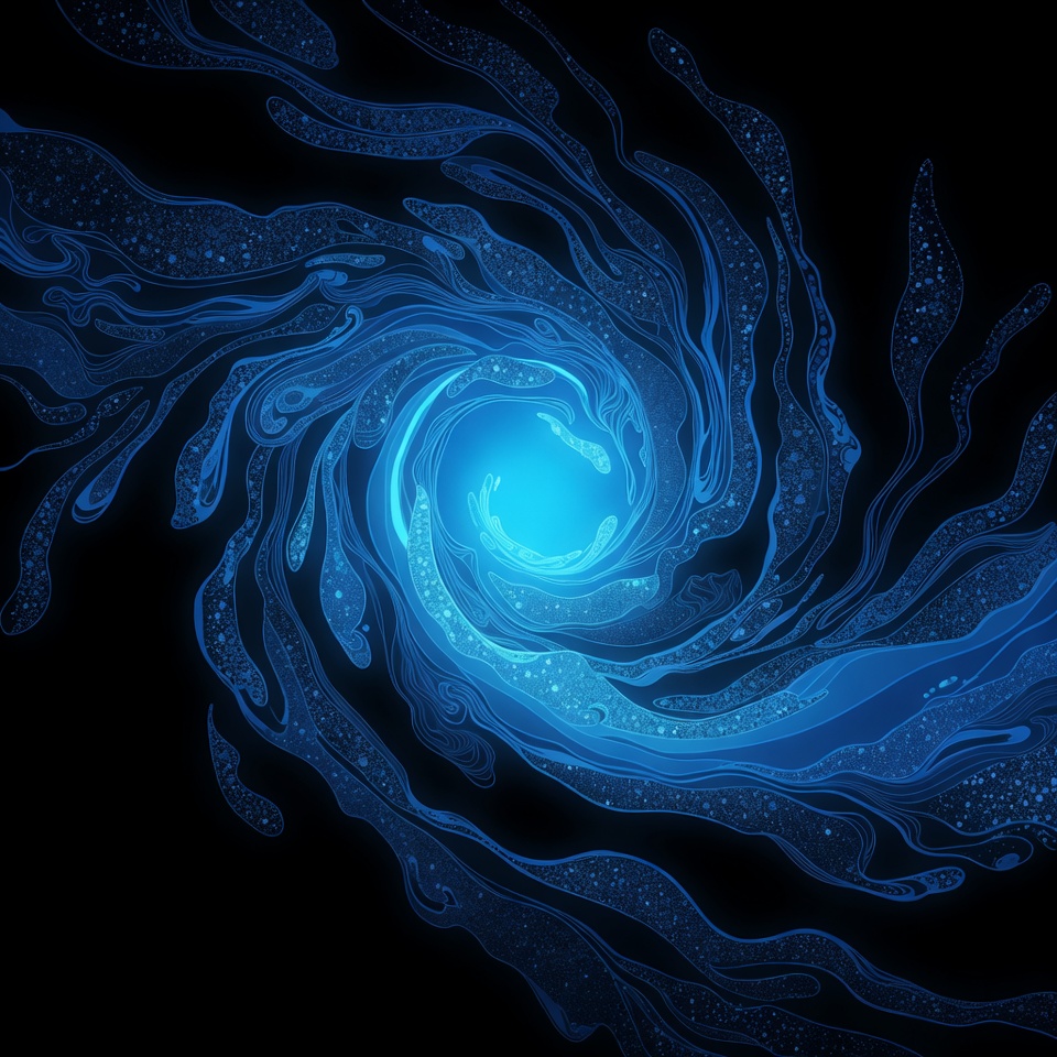A digital illustration features a glowing blue spiral vortex on a black background. The vortex has intricate, fluid tendrils radiating outward from a bright cyan center. Ethereal bubbles and glowing particles enhance the dynamic, swirling motion.