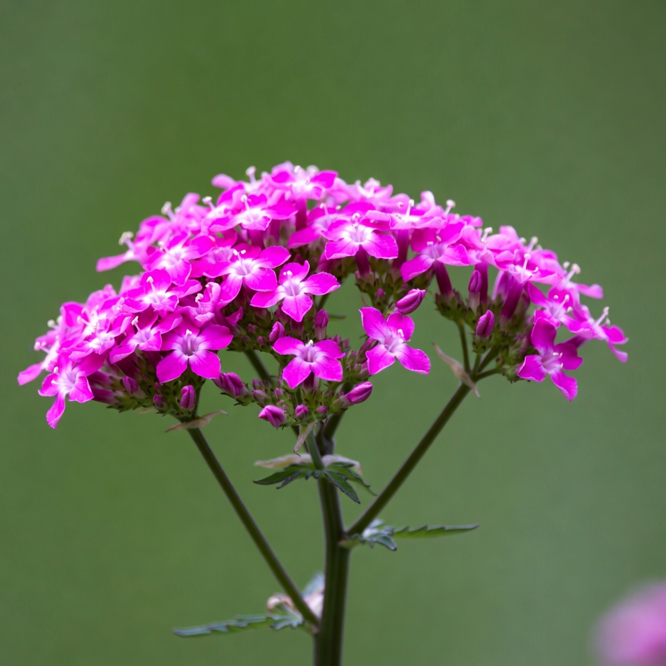 A vibrant cluster of small pink flowers forms a dense umbel atop slender green stems. The blooms feature tiny white centers and are set against a blurred green backdrop. The flower heads are tightly packed, creating a rounded, fluffy appearance.
