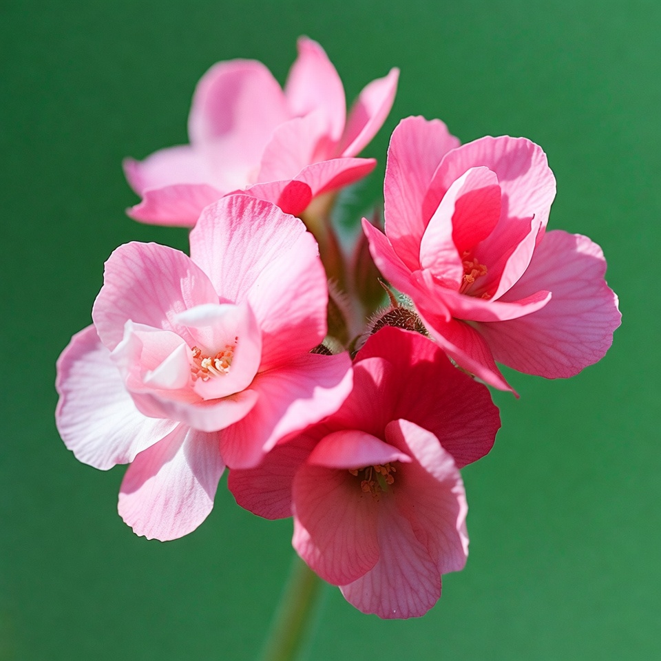bloom, closeup, cluster, delicate petals, floral, flowers, garden flower, green background, isolated background, nature, petals, pink flowers, pink geranium, plant, stem, vibrant pink, geranium