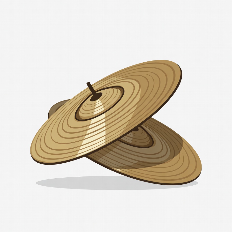 A pair of golden cymbals is depicted in a flat vector illustration style, clashed together with a central connecting pin. Concentric circles detail the surfaces, and subtle shadows add depth on a plain white background.