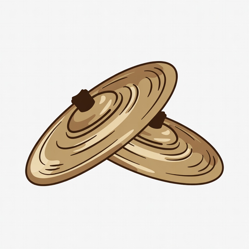 Two brown tambourines are crossed together on a white background. They feature curved edges, concentric ridges, and small black knobs on top. The image is a simple line drawing illustration.