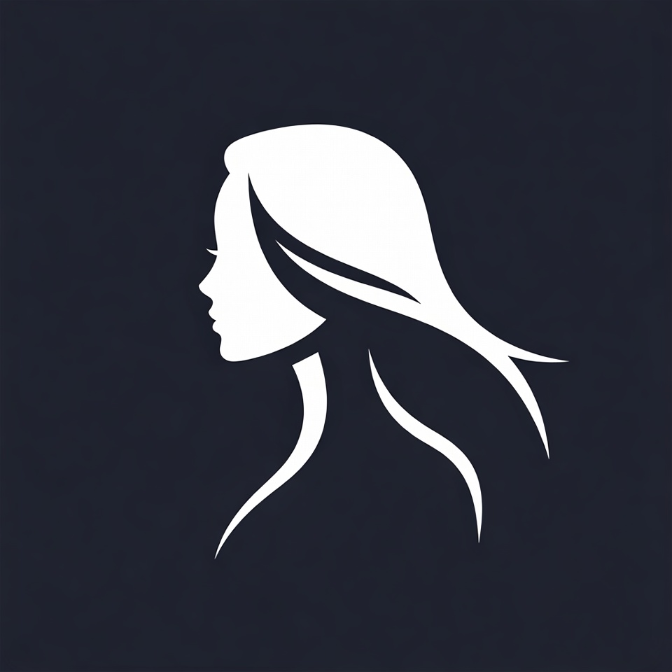 A minimalist white silhouette depicts a woman's profile facing left on a solid dark background. Her long flowing hair cascades down her back and shoulder. The illustration features smooth curves outlining her face, neck, and hair.