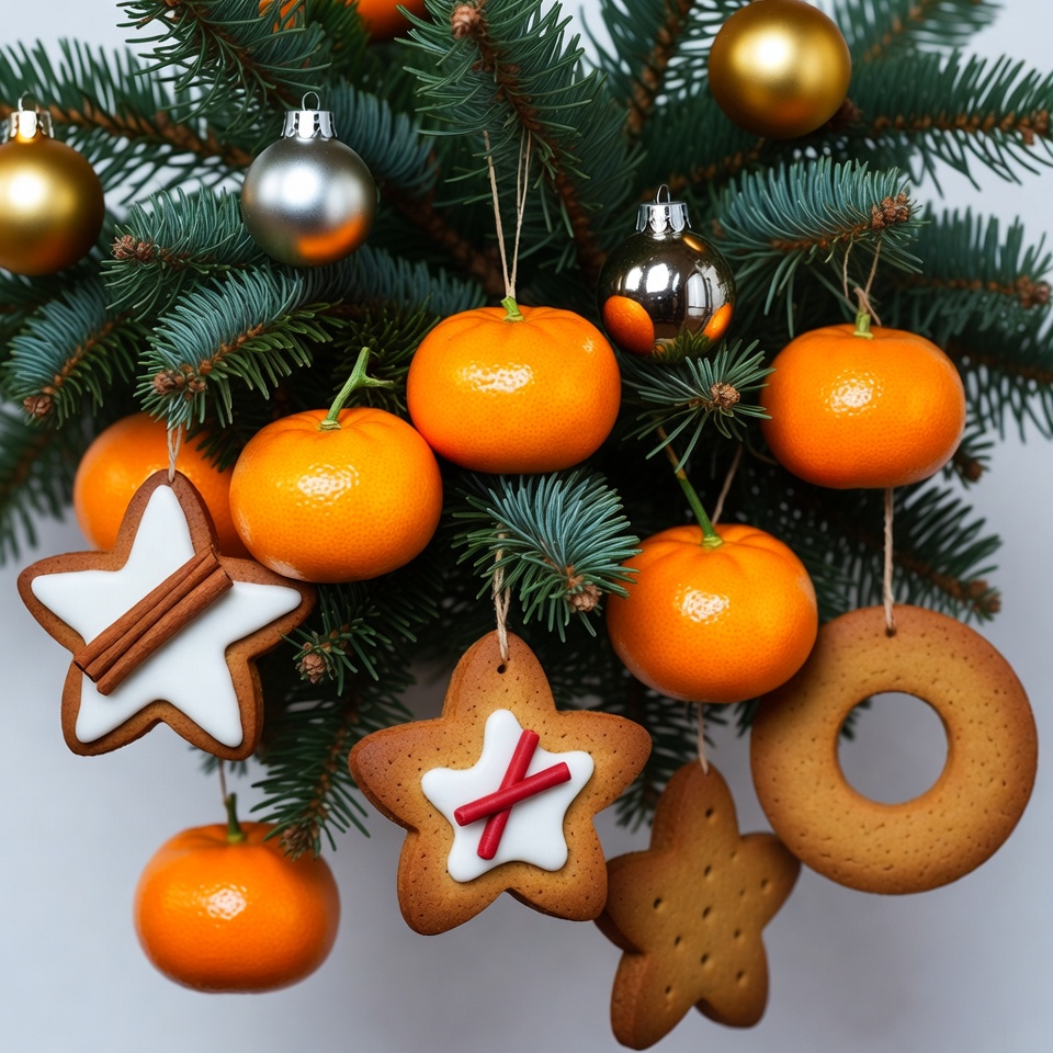 A decorated Christmas tree branch features vibrant orange tangerines hanging among green needles. Gold and silver baubles dangle alongside gingerbread cookies shaped like stars, rings, and crosses with red cinnamon stick accents. The ornaments are suspended by strings on an isolated white background.
