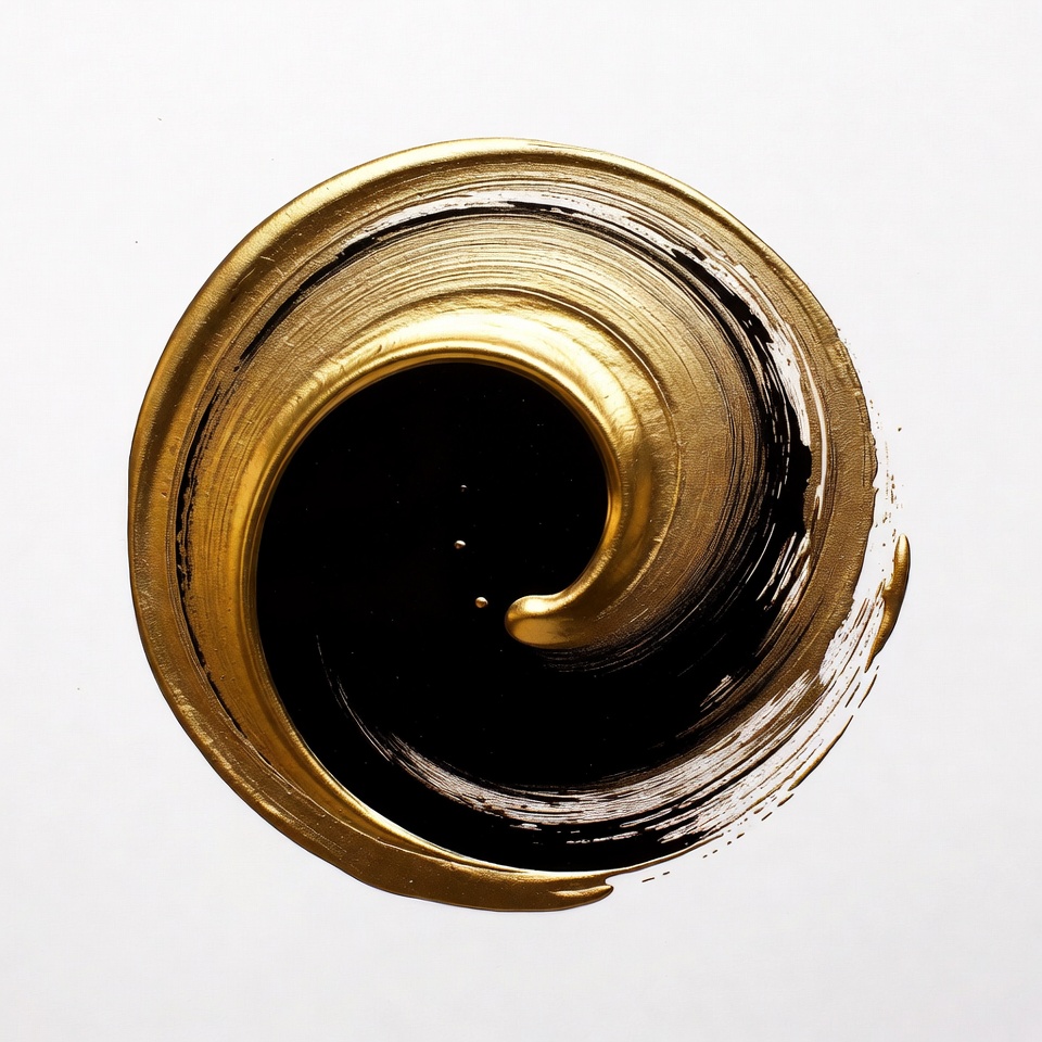 A circular abstract design features swirling gold paint forming a spiral around a dark black center. The metallic gold contrasts sharply with the black on a clean white background. Brush strokes create dynamic texture in the paint.