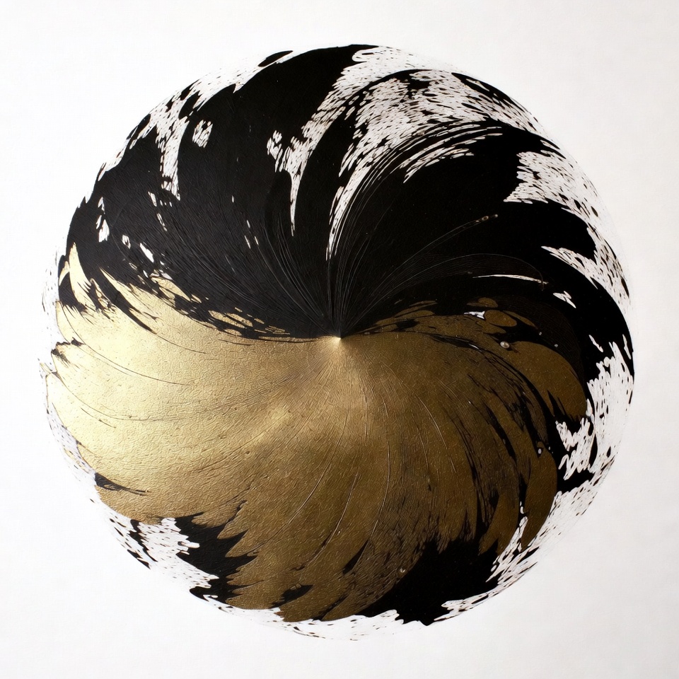 abstract painting, artistic circle, black ink, black swirls, circular design, gold accents, gold circle, ink art, ink splatter, metallic gold, radial pattern, swirling pattern, vortex design, white background, abstract art