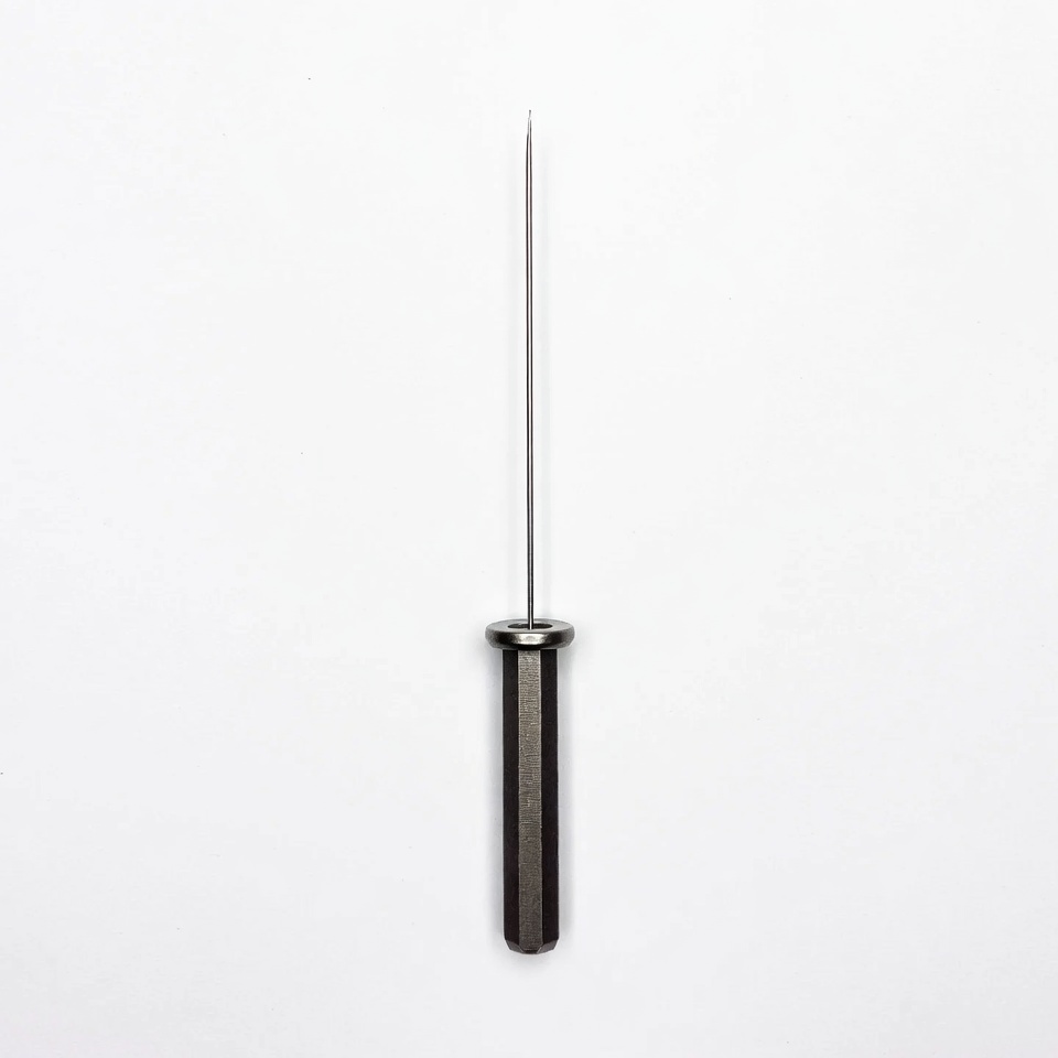 A thin metal needle with a sharp point and hexagonal black handle is positioned vertically. It stands against a plain white background, isolated for clear visibility. The tool appears precise and industrial.