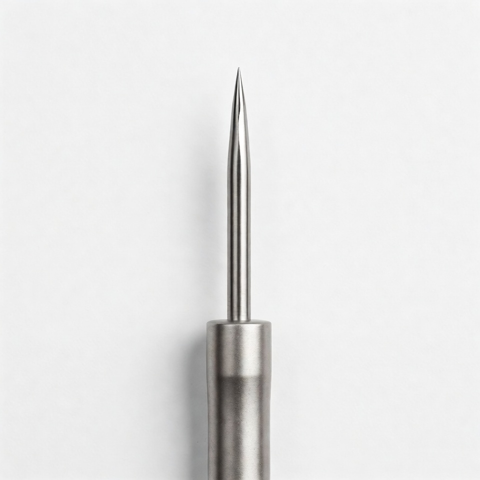 A close-up view of a sharp, pointed metallic needle with a thin shaft and base. The needle stands vertically against a plain white background. Its surface has a shiny, polished finish.