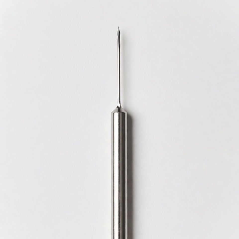 A close-up view of a thin, sharp stainless steel needle with a pointed tip. The needle stands vertically against a plain white background. Its metallic surface reflects light, emphasizing its precision and sharpness.