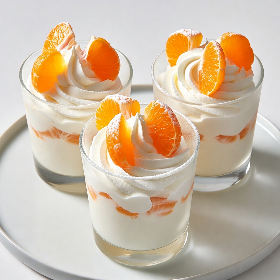 creamy yogurt, dessert, food photography, fresh fruit, fruit dessert, glass cups, gourmet dessert, isolated background, layered yogurt, orange garnish, orange slices, parfait glass, powdered sugar, sweet treat, whipped cream, white plate, yogurt parfait, mandarin oranges