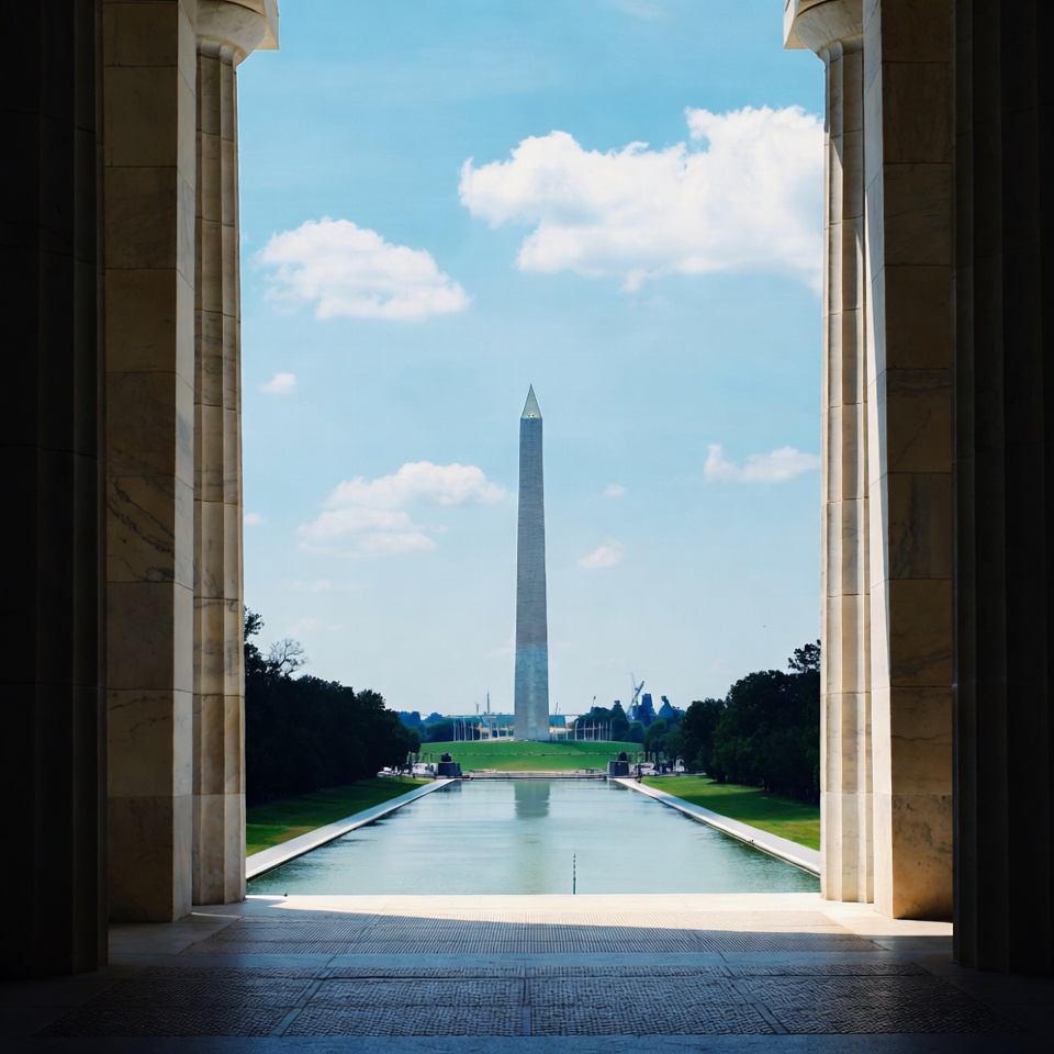 Lincoln Memorial, National Mall, Washington DC, architecture, blue sky, clouds, columns, distant, framed, grass, green trees, historic site, iconic, landmark, landscape, memorial, monument, obelisk, reflecting pool, reflection, stone columns, sunny day, travel, view, water, Washington Monument
