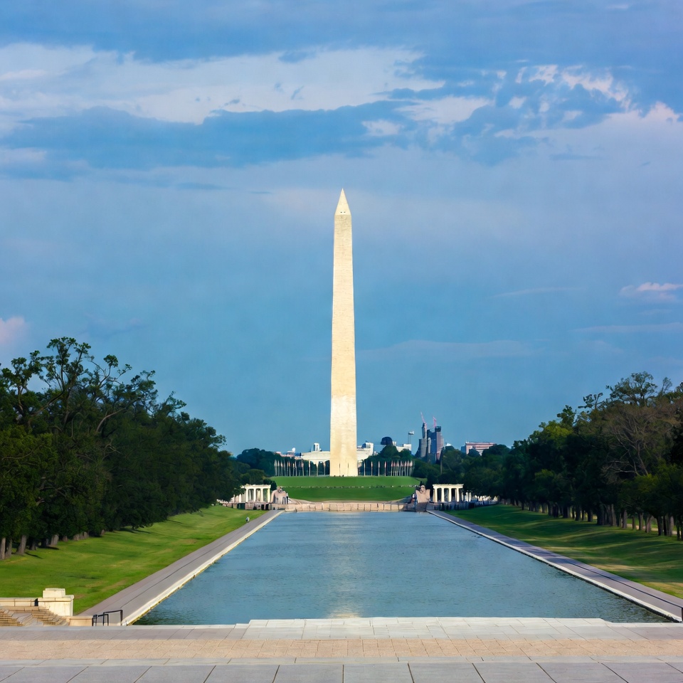 National Mall, Washington DC, architecture, blue sky, clouds, daytime, green grass, historic site, landmark, memorial, monument, obelisk, outdoors, reflecting pool, symmetry, tourism, travel, trees, water reflection, Washington Monument