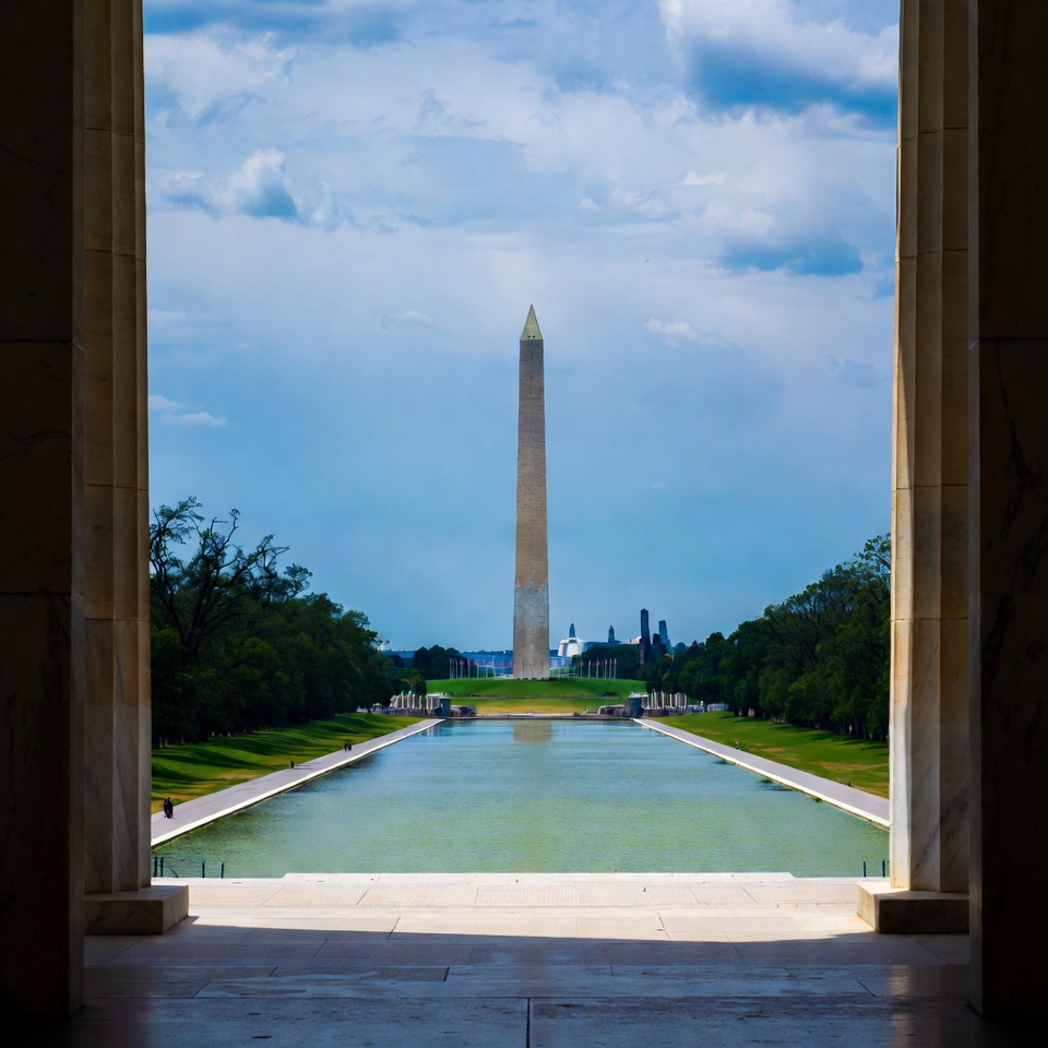 Lincoln Memorial, National Mall, United States, Washington DC, architecture, blue sky, capital, clouds, grass lawn, green trees, historic site, landmark, memorial arch, monument, obelisk, pool water, reflecting pool, steps, stone arch, symmetry, tourism, travel, Washington Monument