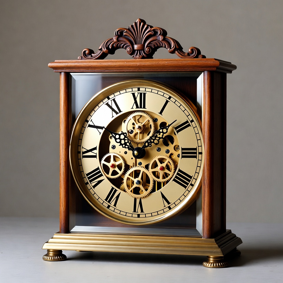 Roman numerals, antique clock, brass gears, carved wood, desk clock, gears, glass sides, gold face, isolated background, luxury clock, mantel clock, mechanical clock, ornate clock, skeleton clock, timepiece, vintage clock, watch mechanism, wood frame, wooden clock, clock