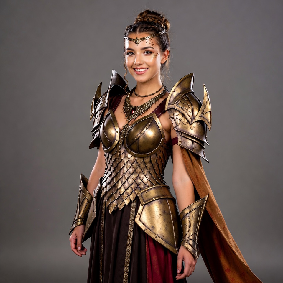 A young woman with braided hair and golden makeup poses confidently in ornate golden scale armor. She wears a low-cut breastplate with shoulder guards, arm bracers, and a flowing maroon cape over a dark dress. The image features a plain gray background.