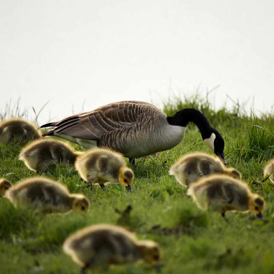 animals, baby geese, bird family, birds, black neck, cute birds, family, feathers, flock, goslings, grass, green grass, isolated background, mother goose, nature, outdoors, protective, spring, standing, waterfowl, white patches, wildlife, yellow goslings, Canada goose
