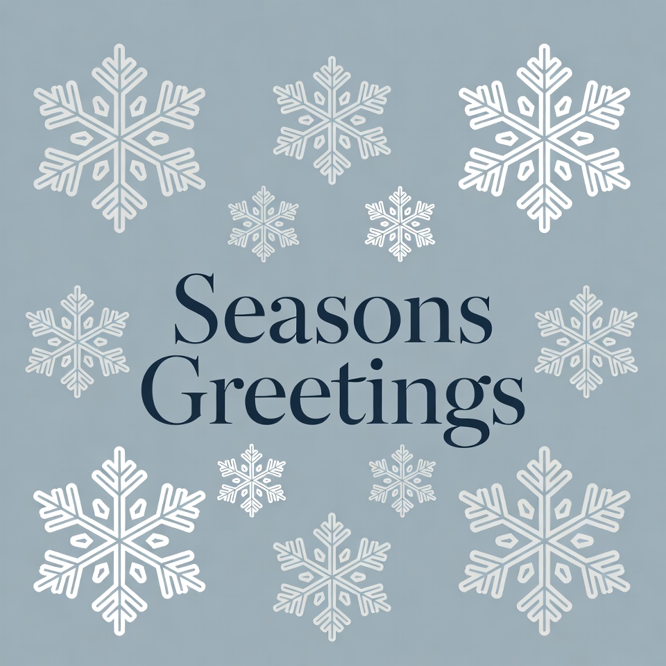 A graphic design features the text 'Seasons Greetings' in elegant navy letters centered on a light blue background. Multiple white snowflake illustrations surround the text symmetrically. The image has a clean, festive holiday appearance with an isolated background.