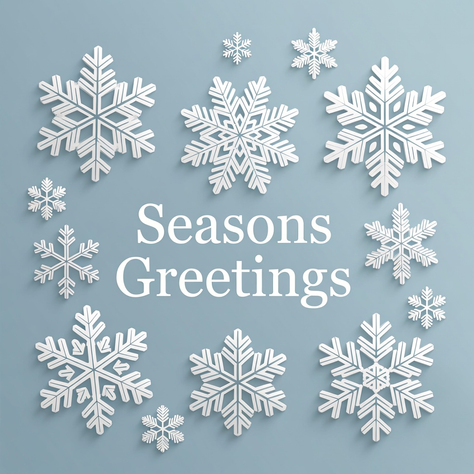 A collection of white 3D paper-cut snowflakes arranged around the text 'Seasons Greetings' on a light blue background. The snowflakes vary in size and are detailed with intricate patterns. The design features a clean, festive holiday illustration.