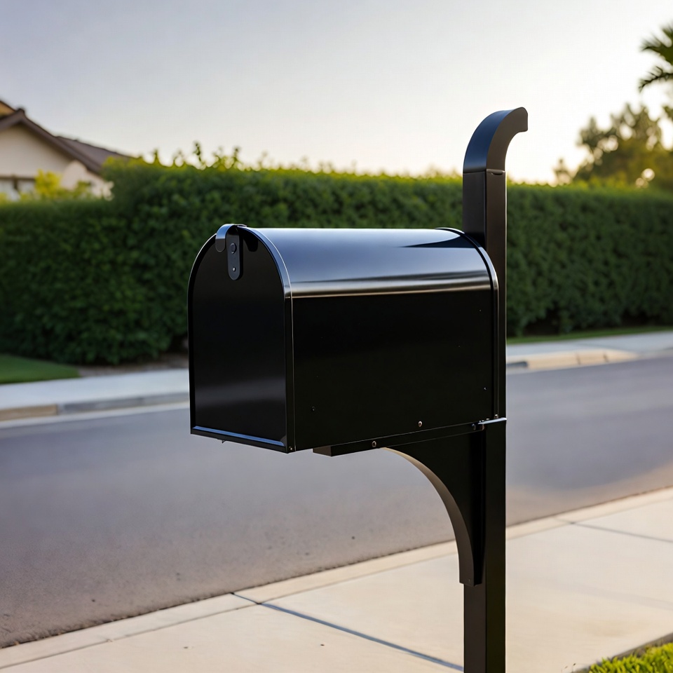 A shiny black arched mailbox stands on a black metal post next to a sidewalk in a suburban neighborhood. A single-story house with a tiled roof and green palm trees are visible in the background, along with a tall green hedge. The scene is set during golden hour with warm sunlight and a clear sky.