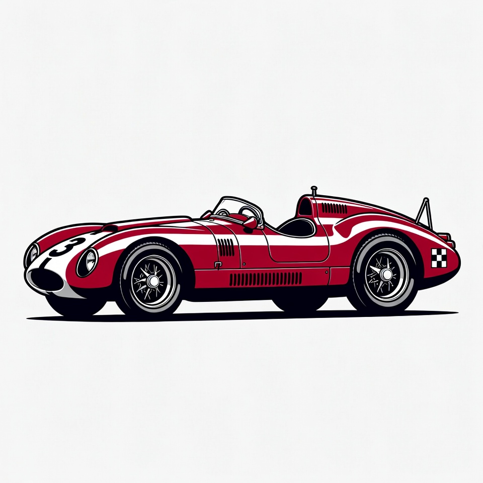 automotive art, car illustration, checkered flag, classic racer, clipart, detailed drawing, grand prix, isolated background, motorsport, open cockpit, racing stripes, red racecar, retro car, side view, speed car, sports car, vector illustration, vintage car, white background, race car