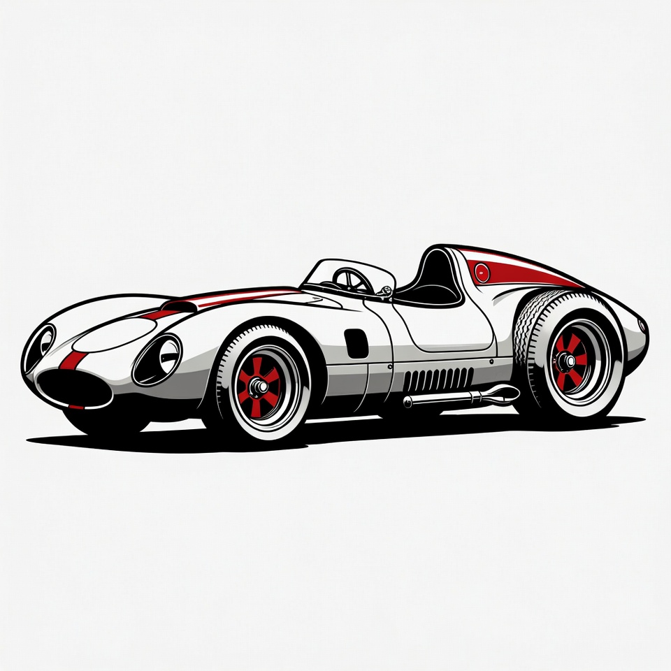 automotive design, classic car, clipart, illustration, isolated background, line art, motorsport, open top, red accents, sports car, tires, vector art, vintage car, wheels, white car, race car