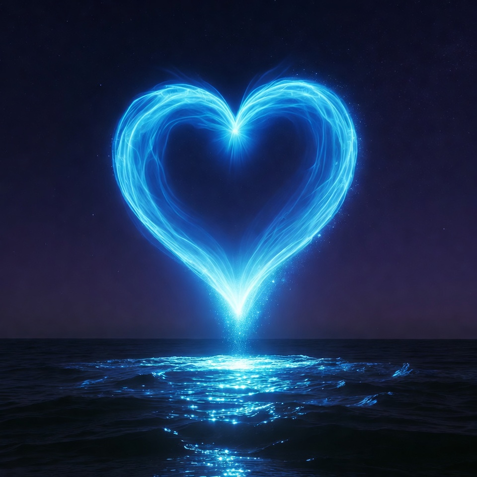 A vibrant neon blue heart glows brightly against a dark night sky. It emits sparkling energy rays downward onto a calm ocean surface below. The water reflects the blue light with shimmering sparkles.