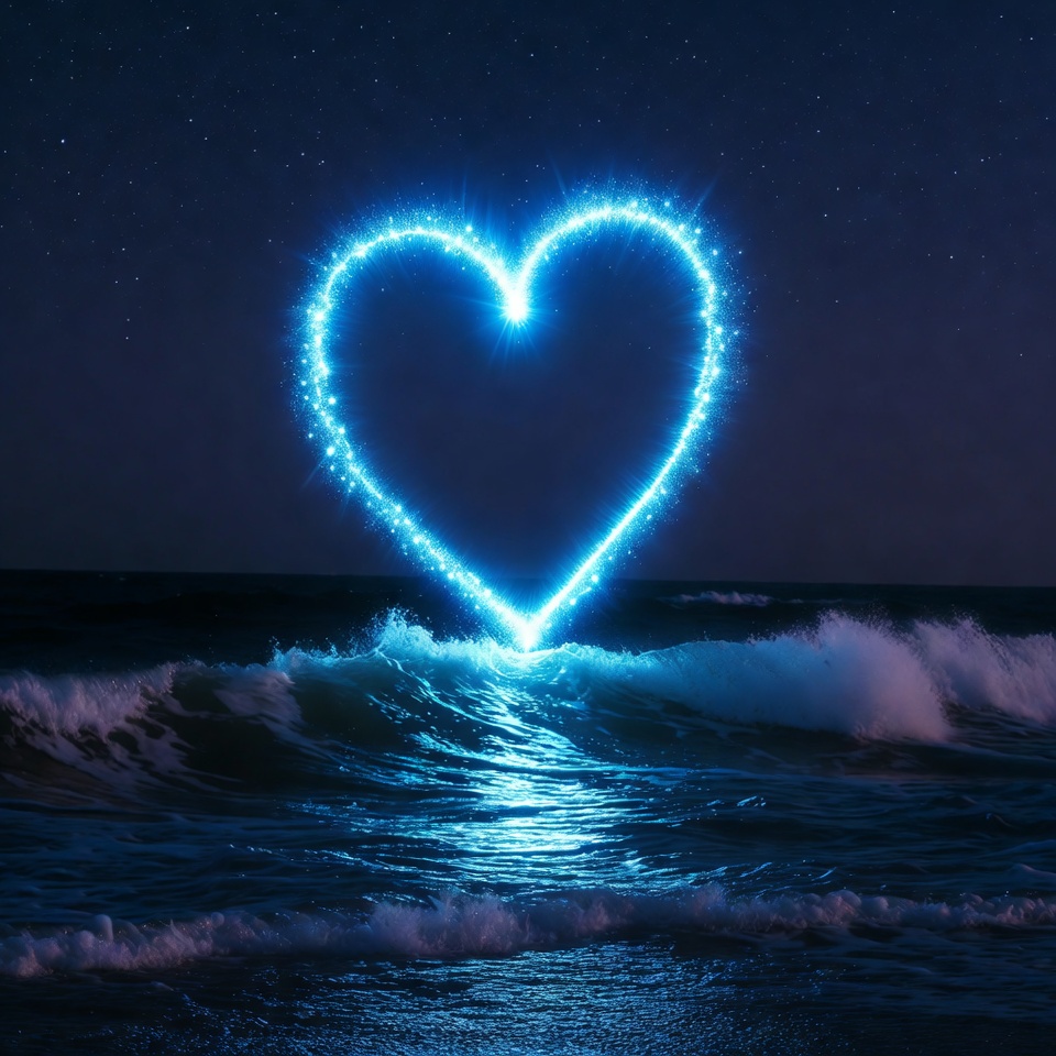 Glowing Blue Heart Over Ocean Waves