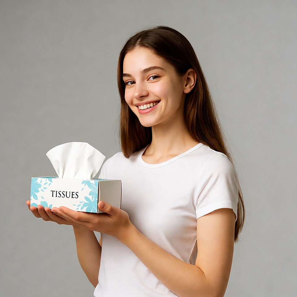 A young woman with long brown hair smiles while holding a blue tissue box with white tissues pulled out. She wears a white t-shirt and stands against a plain gray background. Her hands gently grasp the box in front of her.