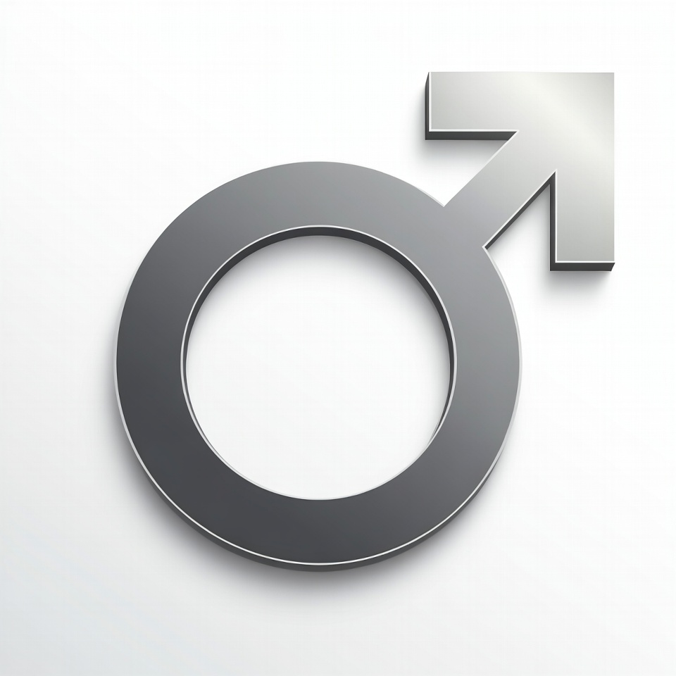 A metallic gray 3D male symbol icon with a circle and upward arrow is centered on a white background. The symbol features a glossy, beveled design for a realistic metallic appearance. It is isolated and prominently displayed.