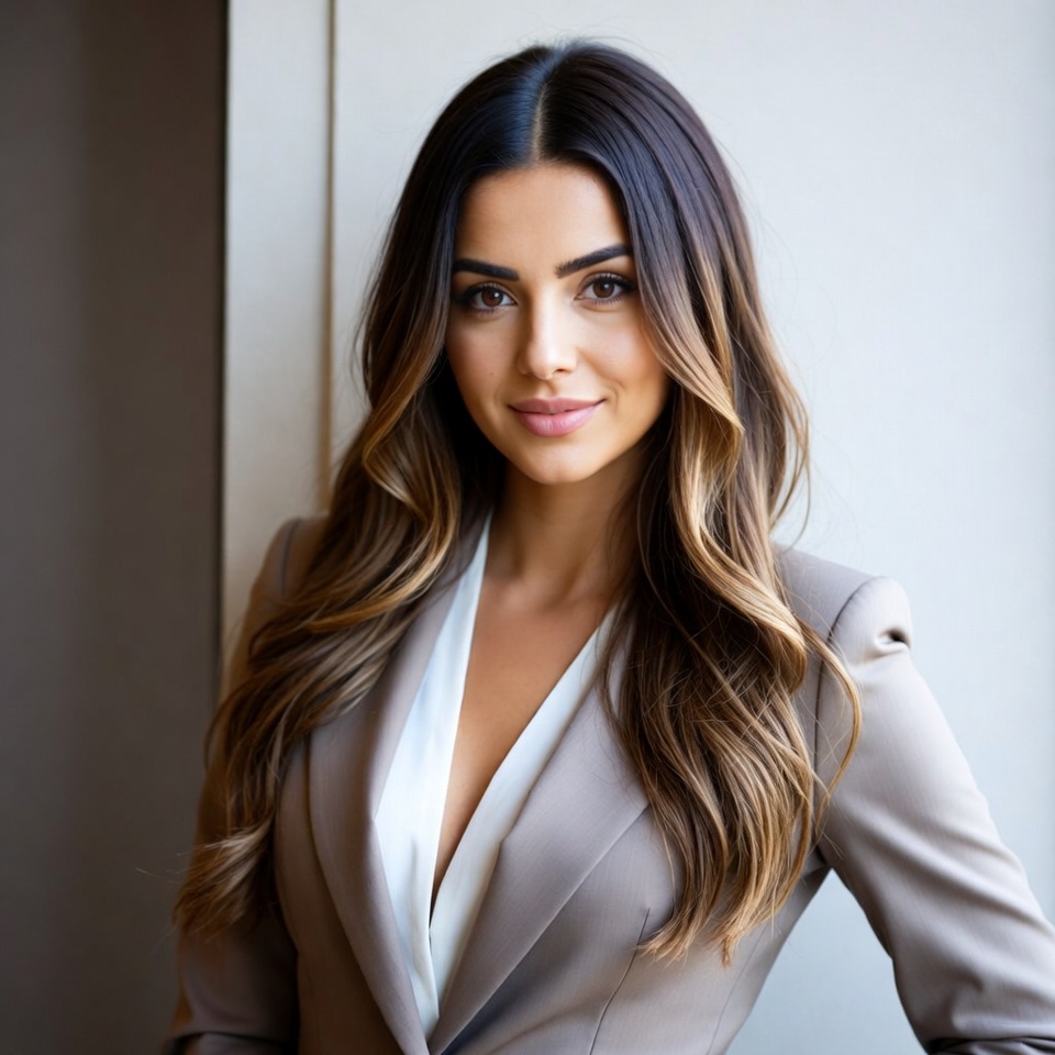 A woman with long wavy brunette hair highlighted with blonde stands confidently in front of a white door. She wears a gray blazer over a white plunging blouse, smiling softly at the camera. Her makeup is natural with pink lips.