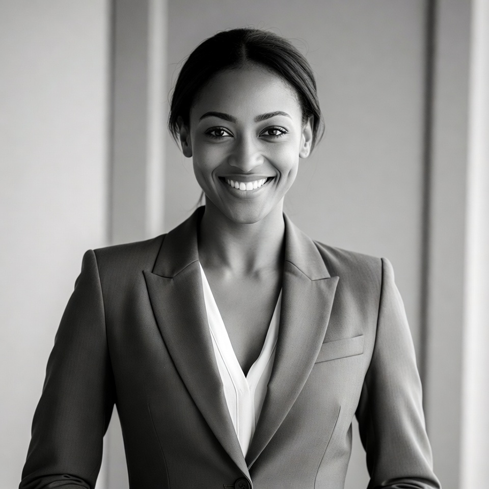 A young African-American woman with her hair in a neat bun smiles warmly at the camera. She wears a tailored black blazer over a white blouse in a professional setting with large windows and neutral walls in the background. The image is captured in black and white.