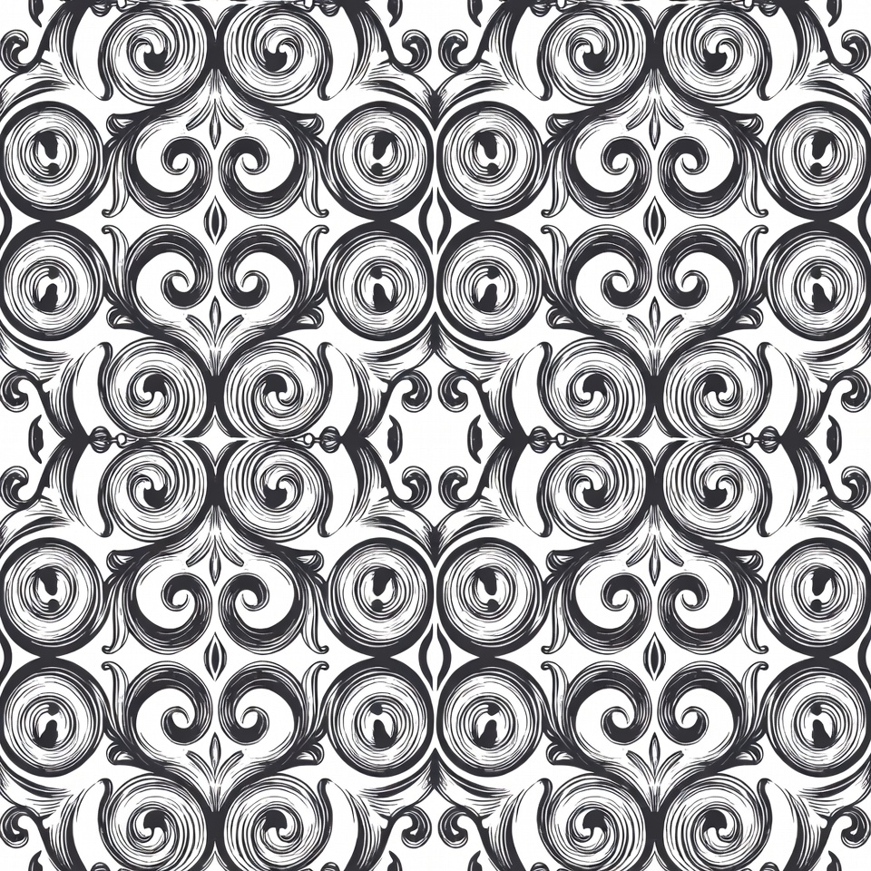 A seamless black and white vector pattern features intricate swirling floral and scroll motifs. The design includes elegant curls, leaves, and symmetrical ornaments arranged in a repeating tile layout. It has a vintage baroque style on an isolated white background.