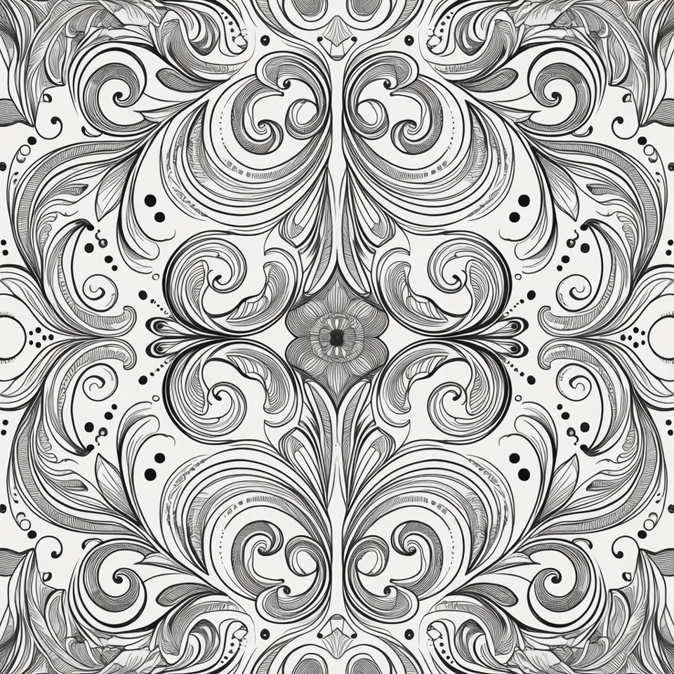 An intricate black line art pattern features swirling vines, elaborate flourishes, and a central flower. Symmetrical curls and dots create a seamless ornamental design on a white background. The detailed engraving style evokes vintage decorative motifs.